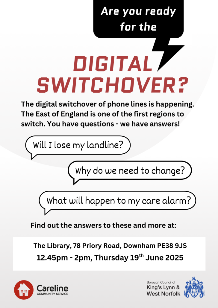 Lorcan from Careline Community Service attended Downham library to give a short talk and and answer your questions about the digital switchover of phone lines. If you have a care alarm or are reliant on your landline in other ways, you need to be prepared for these changes.